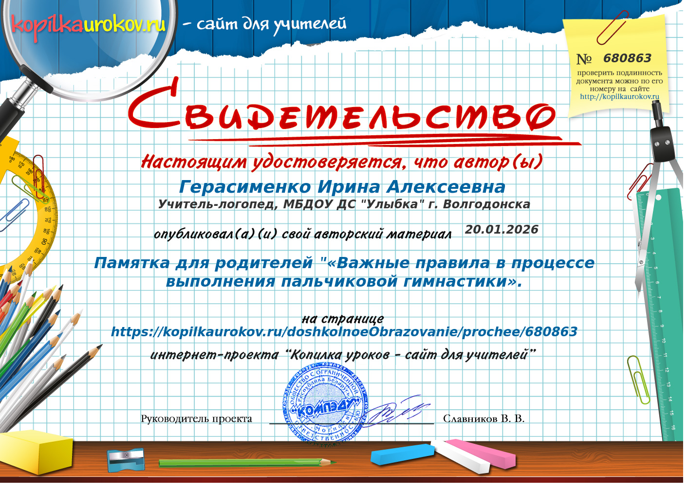 памятка для родителей «Важные правила в процессе выполнения пальчиковой гимнастики» [Электронный ресурс] // 2026. 1 c. URL: