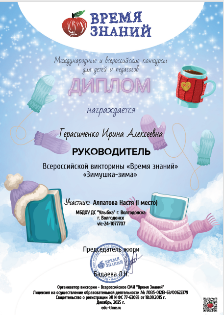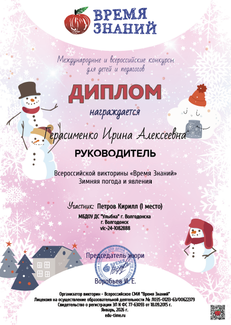 Диплом за организацию воспитанника в Международной викторине для дошкольников «Зимняя погода и явления»